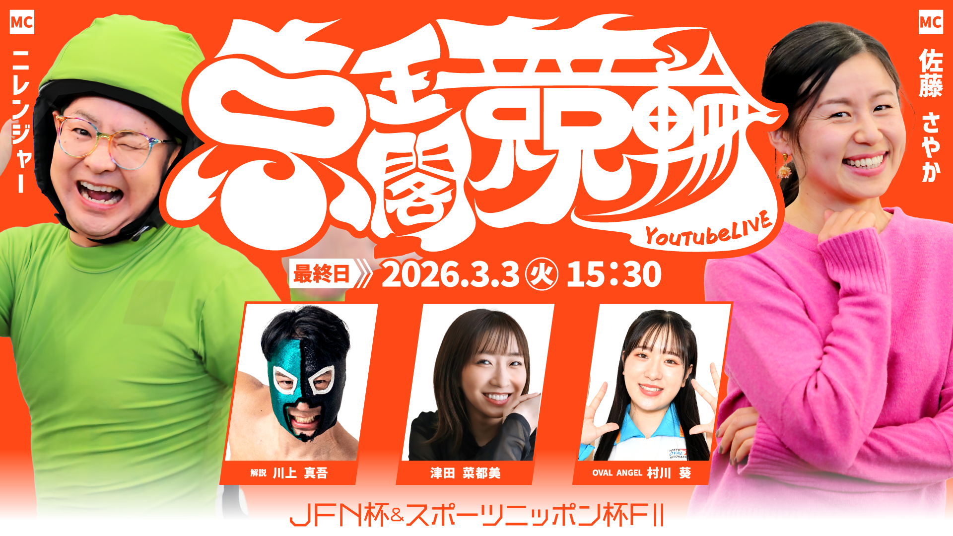 | 3/2(月) | 解説:高橋大作 ニレンジャー 羽瀬萌(OVALANGEL) 選手ゲスト:鈴木薫選手(東京115期)10・11R発売中(19:25頃~20:13頃) |